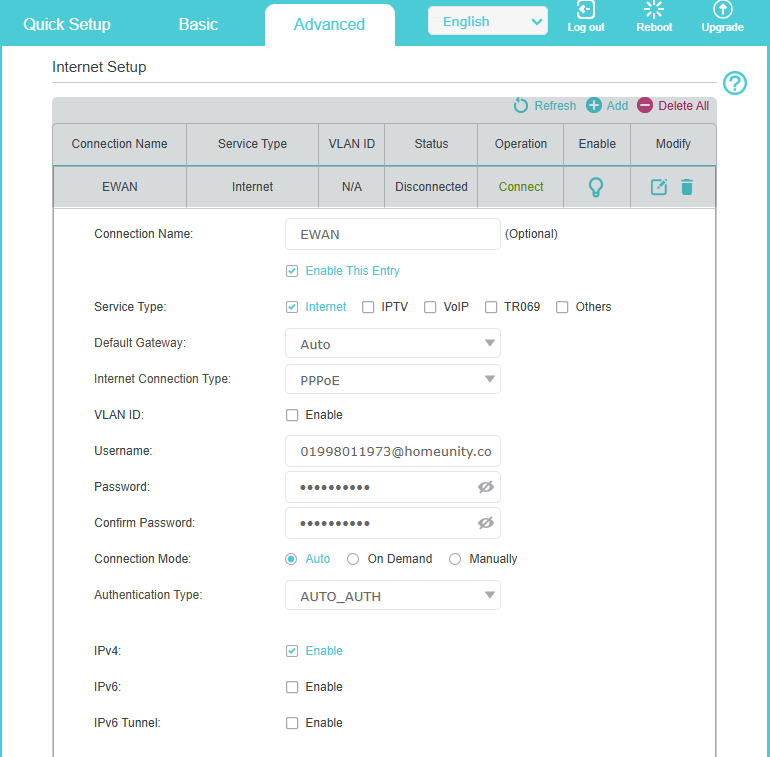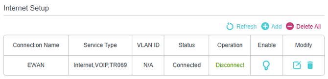 - Now you have clicked on EWAN, You should see a row in the Internet Setup section that says EWAN.